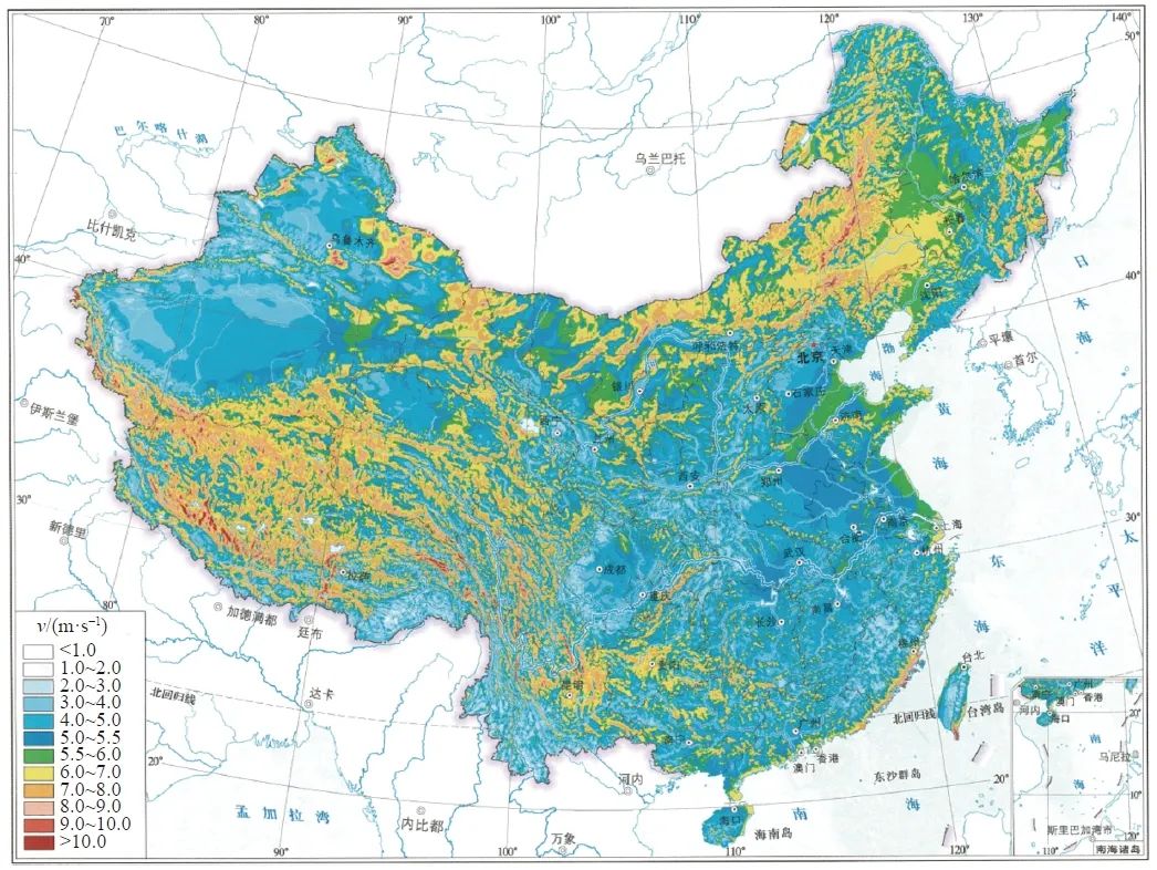 2021年,研究人員在該套數(shù)據(jù)集的基礎(chǔ)上,進一步考慮低風(fēng)速資源開發(fā),評估得到全國陸地100米高度風(fēng)能資源技術(shù)開發(fā)量為3.9太瓦,中國近海5~50米等深線內(nèi)的風(fēng)能資源技術(shù)開發(fā)量為400吉瓦。這些研究成果有力地支撐了我國“十二五”、 “十三五”、 “十四五”期間風(fēng)電大規(guī)模開發(fā)的科學(xué)規(guī)劃和布局。
