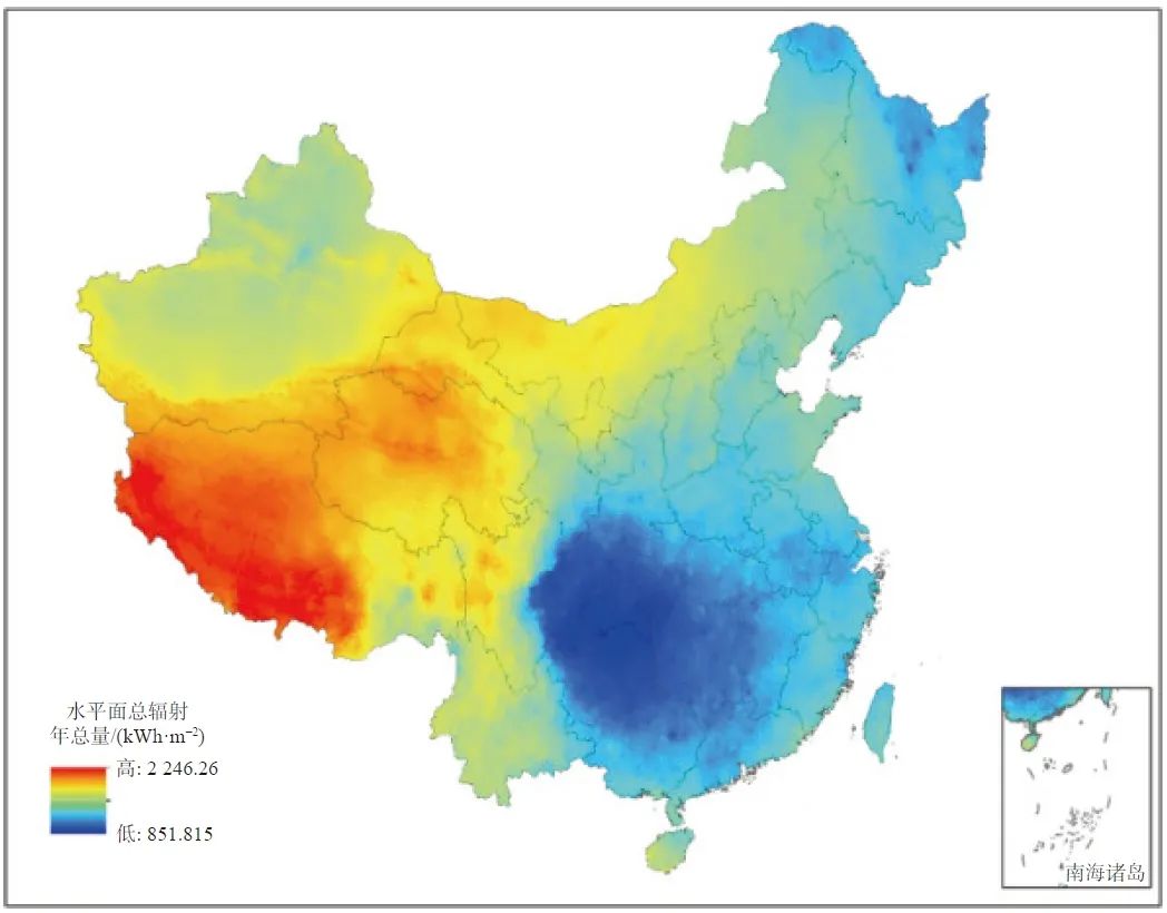 ↑ 全國水平面總輻射年總量空間分布示意圖