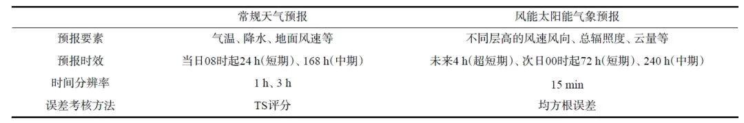 下表對比了風(fēng)能太陽能氣象預(yù)報與常規(guī)天氣預(yù)報的差異,從下表可以看出,無論是預(yù)報要素、預(yù)報時效,還是時間分辨率、誤差考核方法,兩者之間都有明顯差異,風(fēng)能太陽能氣象預(yù)報的要求遠高于常規(guī)天氣預(yù)報,這也為新能源氣象預(yù)報服務(wù)帶來了極大挑戰(zhàn)。