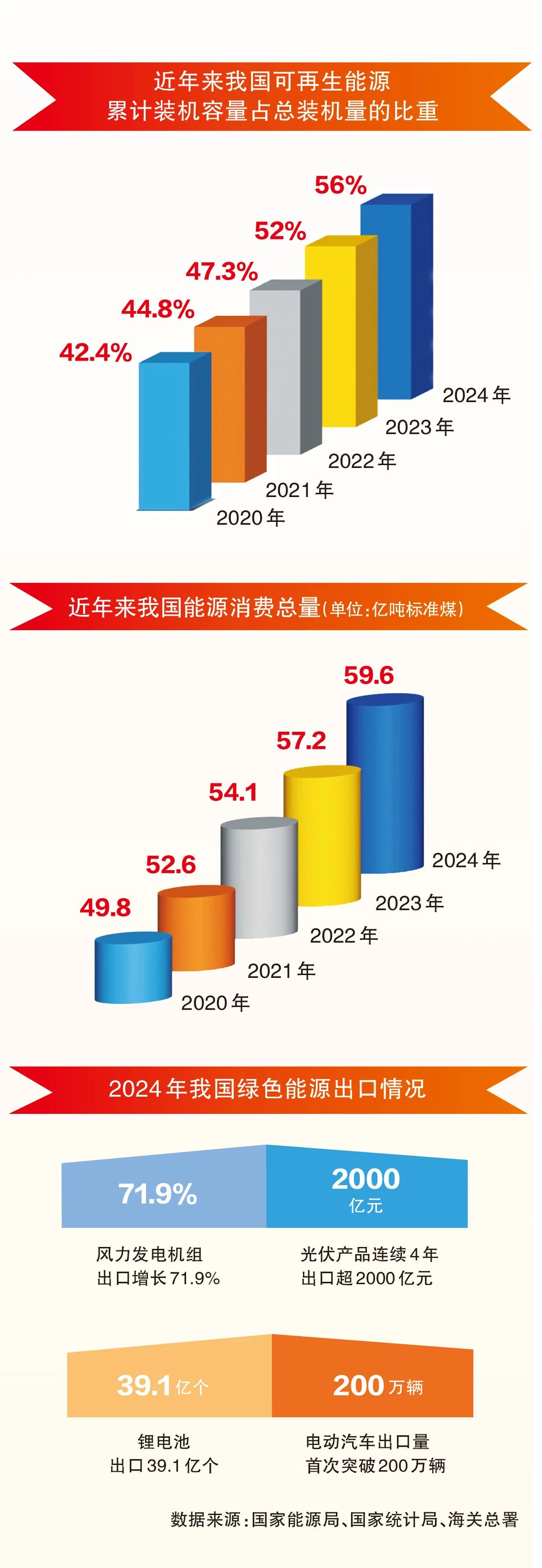 2024年,我國風力發(fā)電機組出口增長71.9%;光伏產品連續(xù)4年出口超2000億元;鋰電池出口39.1億個;電動汽車出口量首次突破200萬輛,創(chuàng)歷史新高。我國的綠色貿易領跑全球。能源成為我國外貿的重要領域之一,拉動總量、增量、質量“三量”齊升。