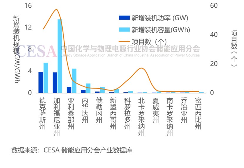 圖 2024年美國(guó)各州大規(guī)模電池儲(chǔ)能新增裝機(jī)規(guī)模及項(xiàng)目數(shù)量