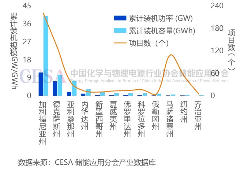 圖 美國(guó)各州大規(guī)模電池儲(chǔ)能累計(jì)裝機(jī)及項(xiàng)目數(shù)