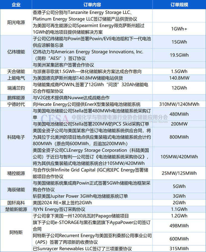 表 2024年中國(guó)企業(yè)新簽美國(guó)儲(chǔ)能訂單(部分)