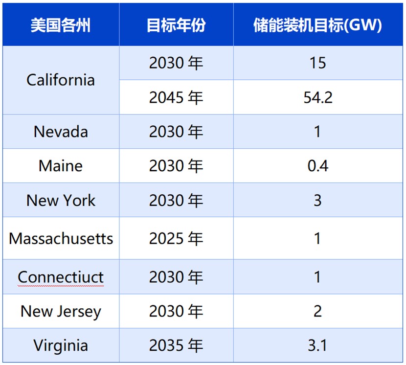 表 美國(guó)儲(chǔ)能各州儲(chǔ)能裝機(jī)目標(biāo)(GW)