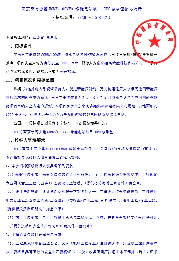 中國儲能網(wǎng)訊:2月28日,協(xié)鑫旗下南京鑫高儲能科技有限公司發(fā)布了南京寧高協(xié)鑫50MW/100MWh儲能電站項(xiàng)目-EPC總承包招標(biāo)公告。項(xiàng)目位于江蘇省南京市,本項(xiàng)目租賃南京寧高協(xié)鑫燃機(jī)熱電有限公司場地,占地面積約6000平方米,建設(shè)5萬千瓦/10萬千瓦時(shí)磷酸鐵鋰電網(wǎng)側(cè)新型儲能電站。