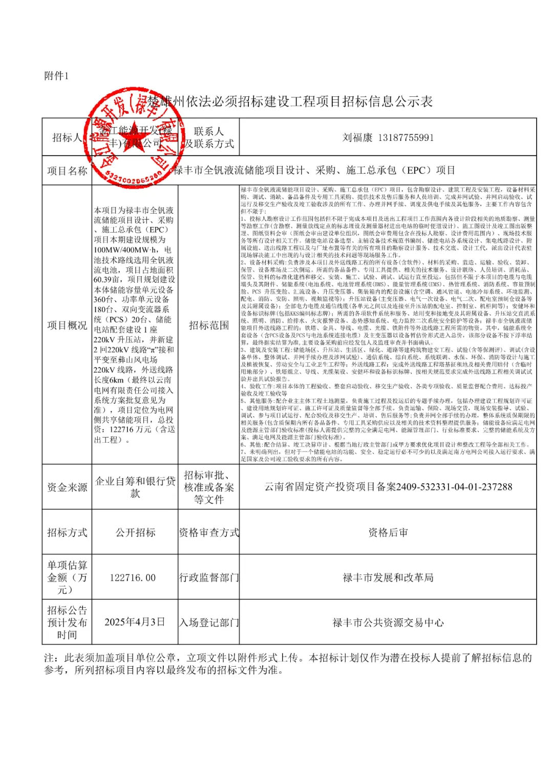 中國(guó)儲(chǔ)能網(wǎng)訊:3月3日,云南省公共資源交易信息網(wǎng)發(fā)布祿豐市全釩液流儲(chǔ)能項(xiàng)目設(shè)計(jì)、采購(gòu)、施工總承包(EPC)項(xiàng)目招標(biāo)計(jì)劃,總投資:122716萬(wàn)元(含送出工程),折合單價(jià):3.0679元/Wh,該招標(biāo)公告預(yù)計(jì)于2025年4月3日發(fā)布。