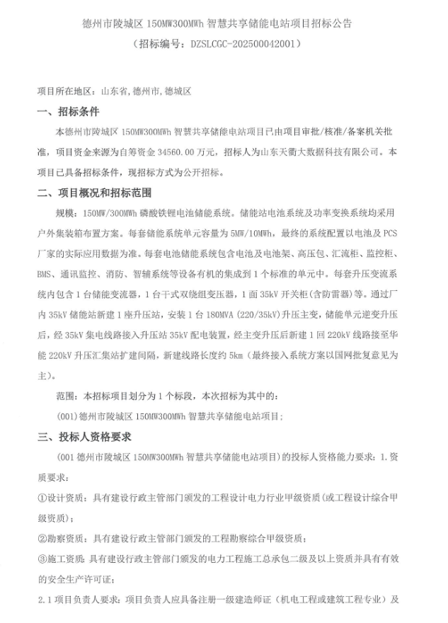 中國儲能網訊:3月1日,山東天衢大數據科技有限公司發(fā)布山東省德州市陵城區(qū)150MW/300MWh智慧共享儲能電站項目招標公告。