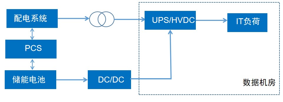國內部分項目探索儲能電池替代UPS電池,通過將儲能電池經DC/DC直流變換器接入UPS,儲能電池在充放電時需預留部分電量,滿足UPS所帶負荷的備電時長要求,從而實現(xiàn)儲能與UPS的融合應用。