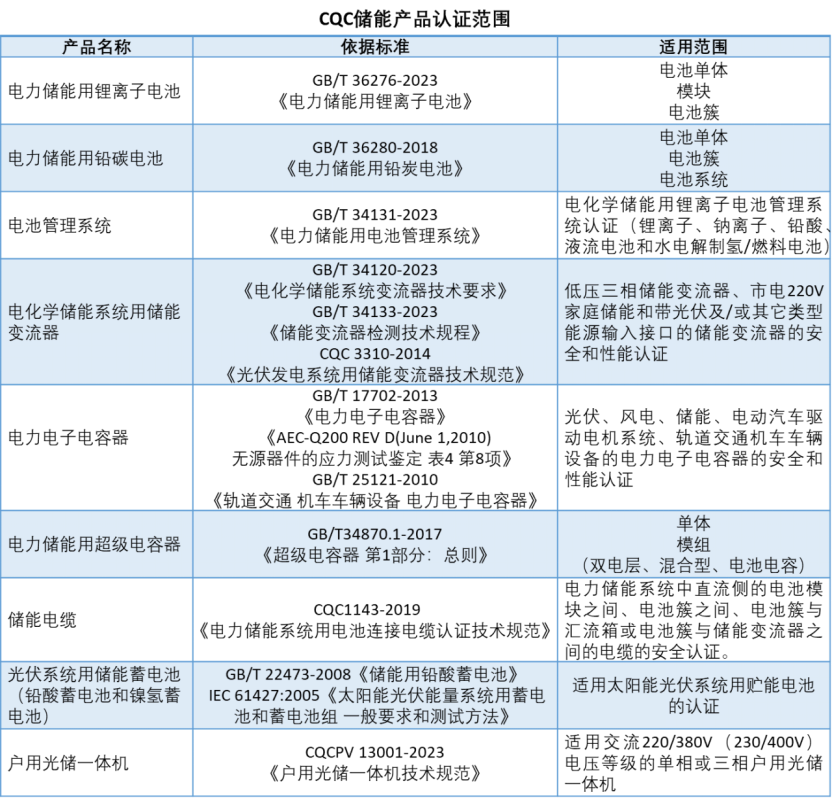 電力儲能產(chǎn)品認(rèn)證范圍包括:電力儲能用鋰離子電池、鉛炭電池、蓄電池、超級電容器、電池管理系統(tǒng)(BMS)、儲能變流器(PCS)、光儲一體機。CQC通過產(chǎn)品的型式檢驗、工廠檢查、獲證后監(jiān)督等流程,對儲能核心部件產(chǎn)品進行全面的質(zhì)量監(jiān)督。