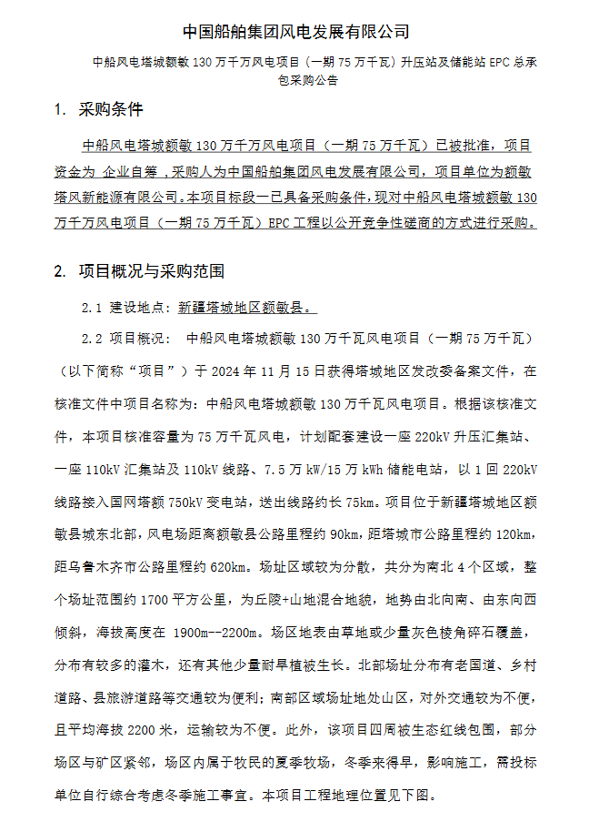 中國(guó)儲(chǔ)能網(wǎng)訊:近日,中國(guó)船舶集團(tuán)發(fā)布中船風(fēng)電塔城額敏130萬(wàn)千萬(wàn)風(fēng)電項(xiàng)目(一期75萬(wàn)千瓦)升壓站及儲(chǔ)能站EPC采購(gòu)。該項(xiàng)目位于新疆塔城地區(qū)額敏縣,由額敏塔風(fēng)新能源有限公司投資建設(shè)容量為1300MW風(fēng)電項(xiàng)目,本期建設(shè)750MW風(fēng)電及儲(chǔ)能,配置儲(chǔ)能容量為風(fēng)電裝機(jī)的10%/2小時(shí),總規(guī)模為75MW/150MWh。