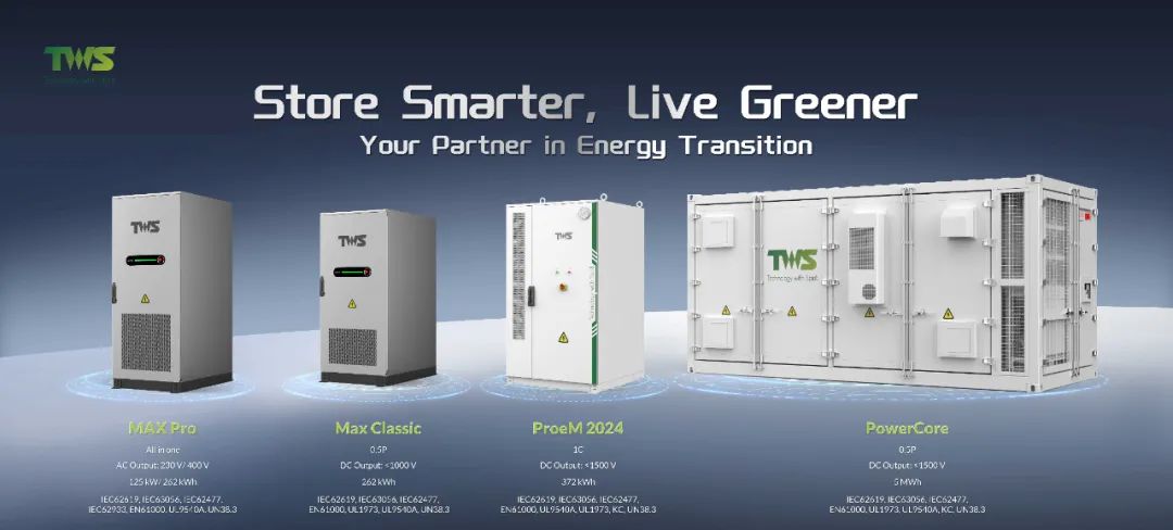 ProeM-2024是TWS明美新能源最新迭代的工商業(yè)儲(chǔ)能柜,具備高效靈活、安全可靠、安裝便捷、智慧友好四大優(yōu)點(diǎn),可實(shí)現(xiàn)1C充放電,同時(shí)設(shè)計(jì)不同容量配置,充分靈活滿足不同客戶的應(yīng)用需求,適用于工業(yè)園區(qū)、商業(yè)綜合體、充電站、微網(wǎng)系統(tǒng)等多種能源存儲(chǔ)應(yīng)用場(chǎng)景。MAX系列是公司在2025年推出的工商業(yè)領(lǐng)域儲(chǔ)能產(chǎn)品,可以滿足工商業(yè)客戶的能源儲(chǔ)存和調(diào)節(jié)需求,具有高效靈活、安裝便捷、安全可靠、智慧友好四大特點(diǎn)。MAX系列包括Max-Pro和Max-Classic兩個(gè)型號(hào),其中Max-Pro內(nèi)置PCS,實(shí)現(xiàn)交直流一體,節(jié)省占地空間,大大簡(jiǎn)化現(xiàn)場(chǎng)安裝調(diào)試工作、并減少售后維護(hù),提高工程安全性、效率和經(jīng)濟(jì)性。公用事業(yè)應(yīng)用領(lǐng)域,TWS PowerCore 5MWh集裝箱儲(chǔ)能系統(tǒng)搭載1P104S液冷電池包,支持2-4小時(shí)系統(tǒng),系統(tǒng)集成度高,一體倉(cāng)出貨,減少安裝和運(yùn)輸成本,具有高安全、高經(jīng)濟(jì)性、更靈活等特點(diǎn)。