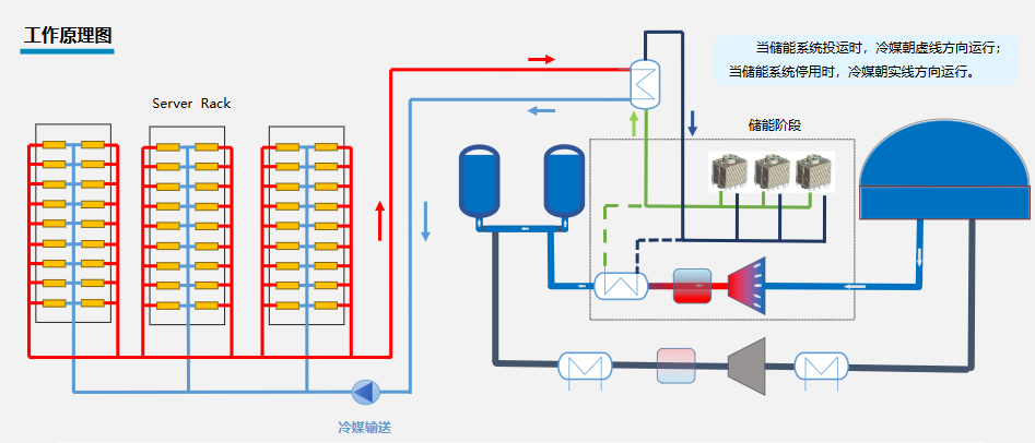 數(shù)據(jù)中心液冷系統(tǒng)中的冷媒吸收芯片散熱后溫度升高,通過管路循環(huán)進(jìn)入二氧化碳儲能系統(tǒng)的釋能階段蒸發(fā)器,與二氧化碳進(jìn)行換熱。冷卻后的冷媒重新進(jìn)入數(shù)據(jù)中心機(jī)柜,持續(xù)為芯片散熱,形成完整的冷卻循環(huán)。這一過程實(shí)現(xiàn)了數(shù)據(jù)中心冷卻需求與儲能系統(tǒng)用熱需求的高效匹配,充分利用了數(shù)據(jù)中心的廢熱資源。