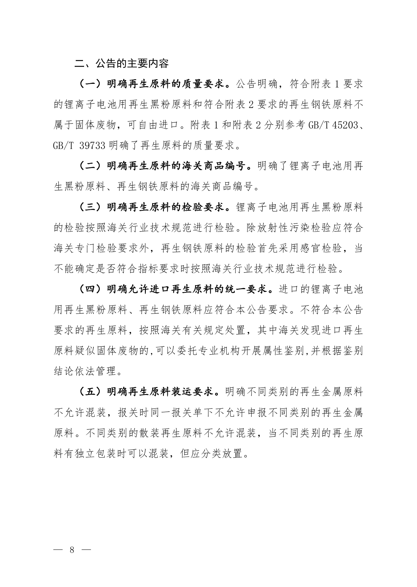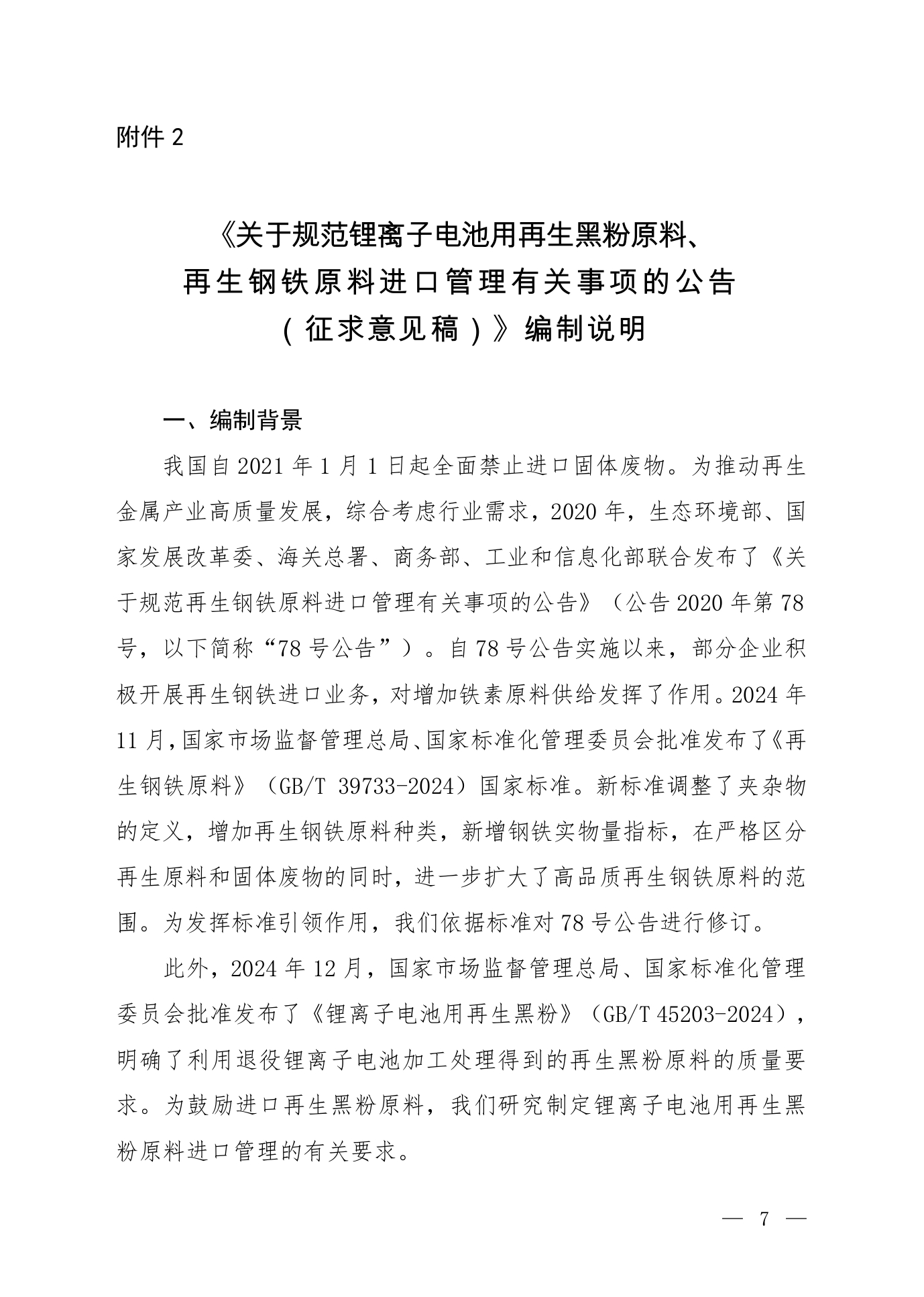 2.《關(guān)于規(guī)范鋰離子電池用再生黑粉原料、再生鋼鐵原料進(jìn)口管理有關(guān)事項(xiàng)的公告(征求意見稿)》編制說明