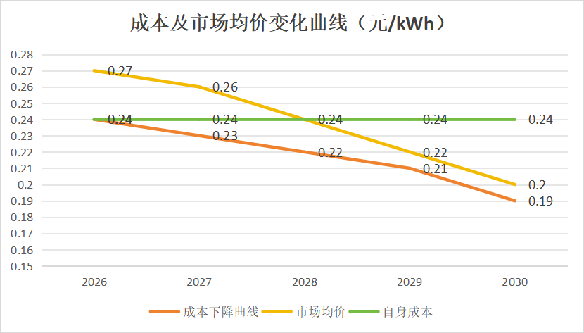 情景一:投產(chǎn)當(dāng)年按照成本報價,中標(biāo)價等于成本價,但低于當(dāng)年市場均價,5年內(nèi)平均電價為0.24元/kWh;