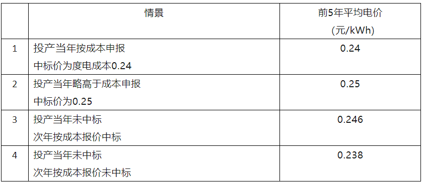 情景四:投產(chǎn)當(dāng)年按照略高于成本價申報,未中標(biāo);投產(chǎn)次年按照成本報價,仍未中標(biāo),則5年內(nèi)平均電價為