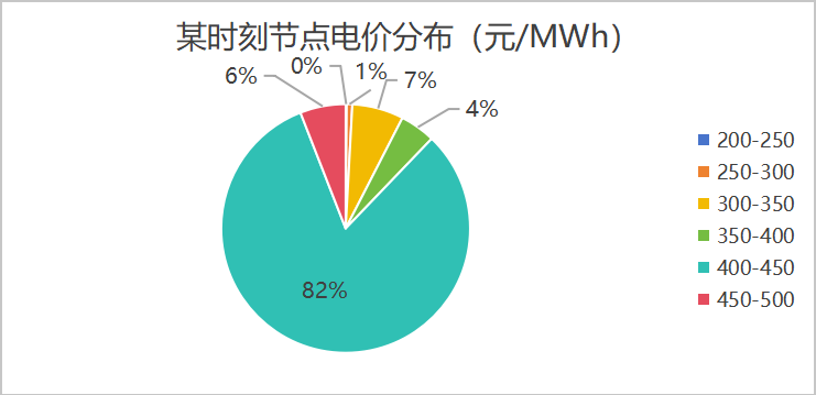 以廣東電力市場某時刻的節(jié)點電價為例。上圖為廣東電力市場某時刻節(jié)點電價分布,此時平均電價約426元/MWh,但各節(jié)點電價從205元/MWh到541元/MWh不等,有18%的電站與市場交易均價的差異超過25元/MWh。