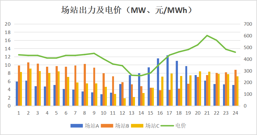 現(xiàn)貨市場環(huán)境下,市場交易均價取發(fā)電側(cè)實時市場同類項目加權(quán)平均價格確定,而不同項目的資源特性存在差異,假如有A、B、C三座電站某月分時平均出力曲線如圖所示,則其分時加權(quán)價格分別為422元/MWh、416元/MWh、430元/MWh,即場站C由于出力取消和電價曲線更加匹配,能夠達(dá)到更高水平的收益。