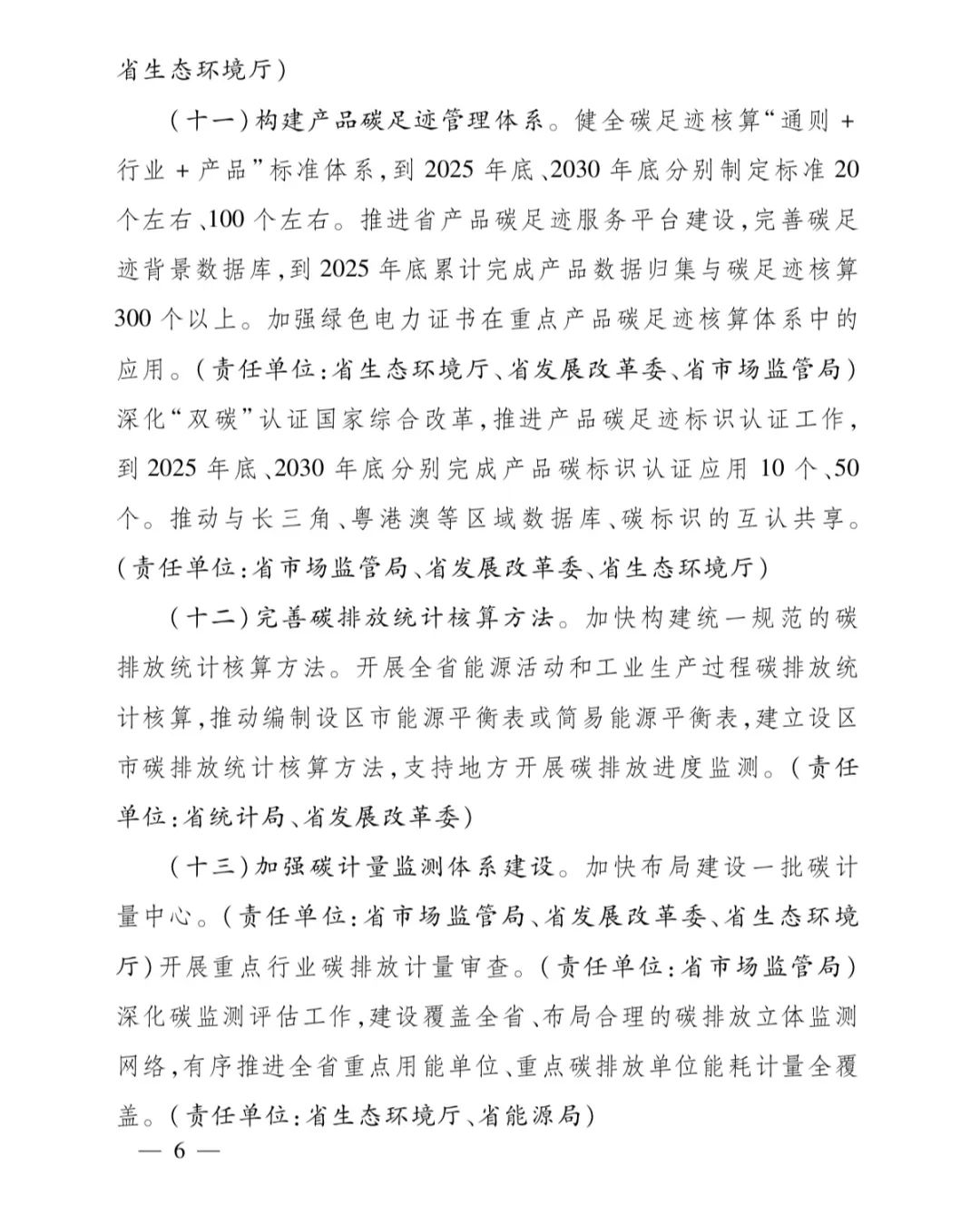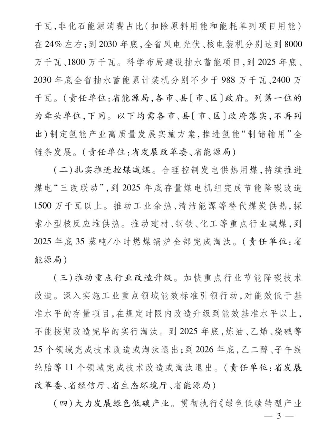 舉措明確對“十四五”期間的碳排放工作進(jìn)行了總結(jié),碳排放雙控先行先試、碳排放預(yù)算管理編制探索、碳排放統(tǒng)計(jì)核算能力均取得了良好的成果?!笆逦濉睍r(shí)期,實(shí)施以強(qiáng)度控制為主、總量控制為輔的碳排放雙控制度,建立健全地方碳考核、區(qū)域碳預(yù)算、行業(yè)碳管控、企業(yè)碳管理、項(xiàng)目碳評價(jià)、產(chǎn)品碳足跡等配套制度,確保如期實(shí)現(xiàn)碳達(dá)峰目標(biāo)。在推進(jìn)碳減排重點(diǎn)工作上。要大力發(fā)展非化石能源,推進(jìn)“光伏+”行動(dòng),有序推進(jìn)核電、海上風(fēng)電項(xiàng)目建設(shè),大力發(fā)展生物質(zhì)能、地?zé)崮堋⒑Q竽艿刃履茉础?strong>到2025年底,新增風(fēng)電光伏裝機(jī)600萬千瓦、核電裝機(jī)100萬千瓦,非化石能源消費(fèi)占比(扣除原料用能和能耗單列項(xiàng)目用能)在24%左右;到2030年底,全省風(fēng)電光伏、核電裝機(jī)分別達(dá)到8000萬千瓦、1800萬千瓦。