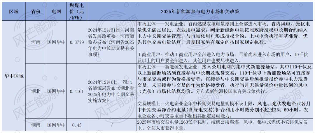 從已有政策層面來(lái)看,河南、湖北兩省已發(fā)布2025年電力交易方案。整體來(lái)看,除湖南外,2025年市場(chǎng)交易規(guī)模與2024年基本持平;入市主體和入市比例有所變化。