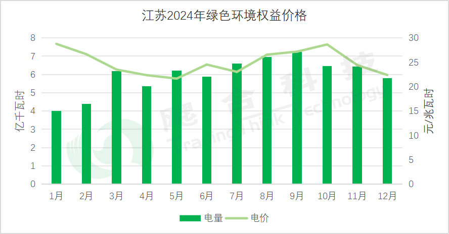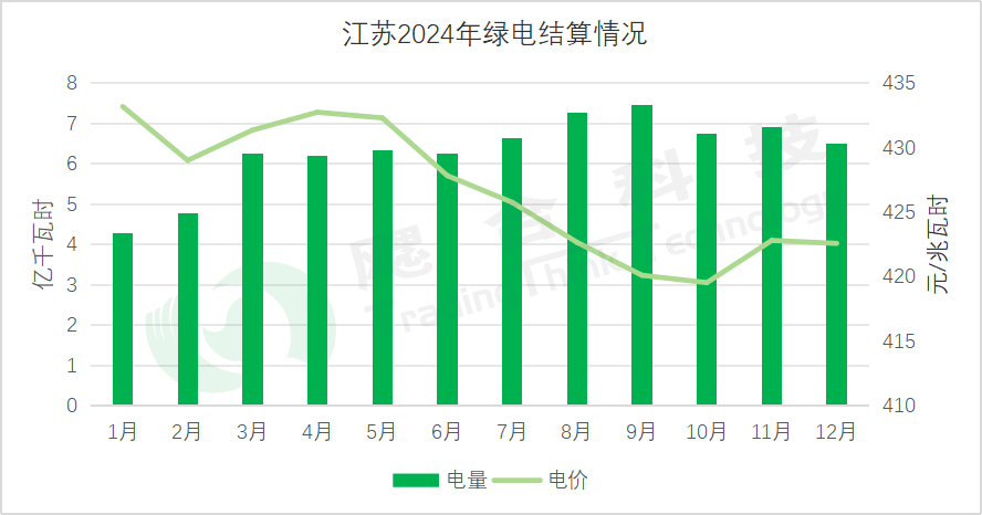 江蘇省優(yōu)先發(fā)電價(jià)格為燃煤基準(zhǔn)價(jià)391元/兆瓦時(shí)。江蘇省新能源場(chǎng)站綠電交易以外的電量以煤電基準(zhǔn)價(jià)執(zhí)行全額保障性收購(gòu)。2024年江蘇綠電結(jié)算均價(jià)426.19元/兆瓦時(shí),綠色環(huán)境權(quán)益均價(jià)24.92元/兆瓦時(shí)。