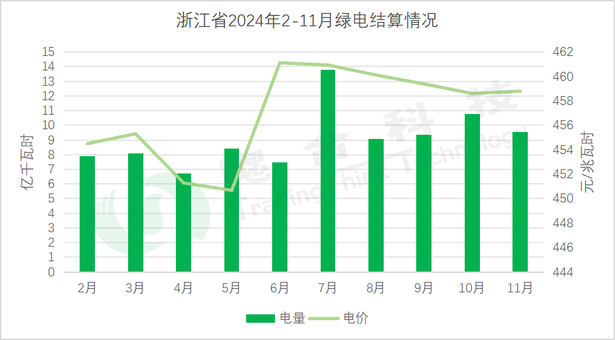 浙江:2024年,浙江電力交易中心配合北京電力交易中心組織綠電交易25場(chǎng),成交電量合計(jì)113.59億千瓦時(shí)。2024年2-11月浙江省結(jié)算綠電約91億千瓦時(shí),均價(jià)457.49元/兆瓦時(shí)。