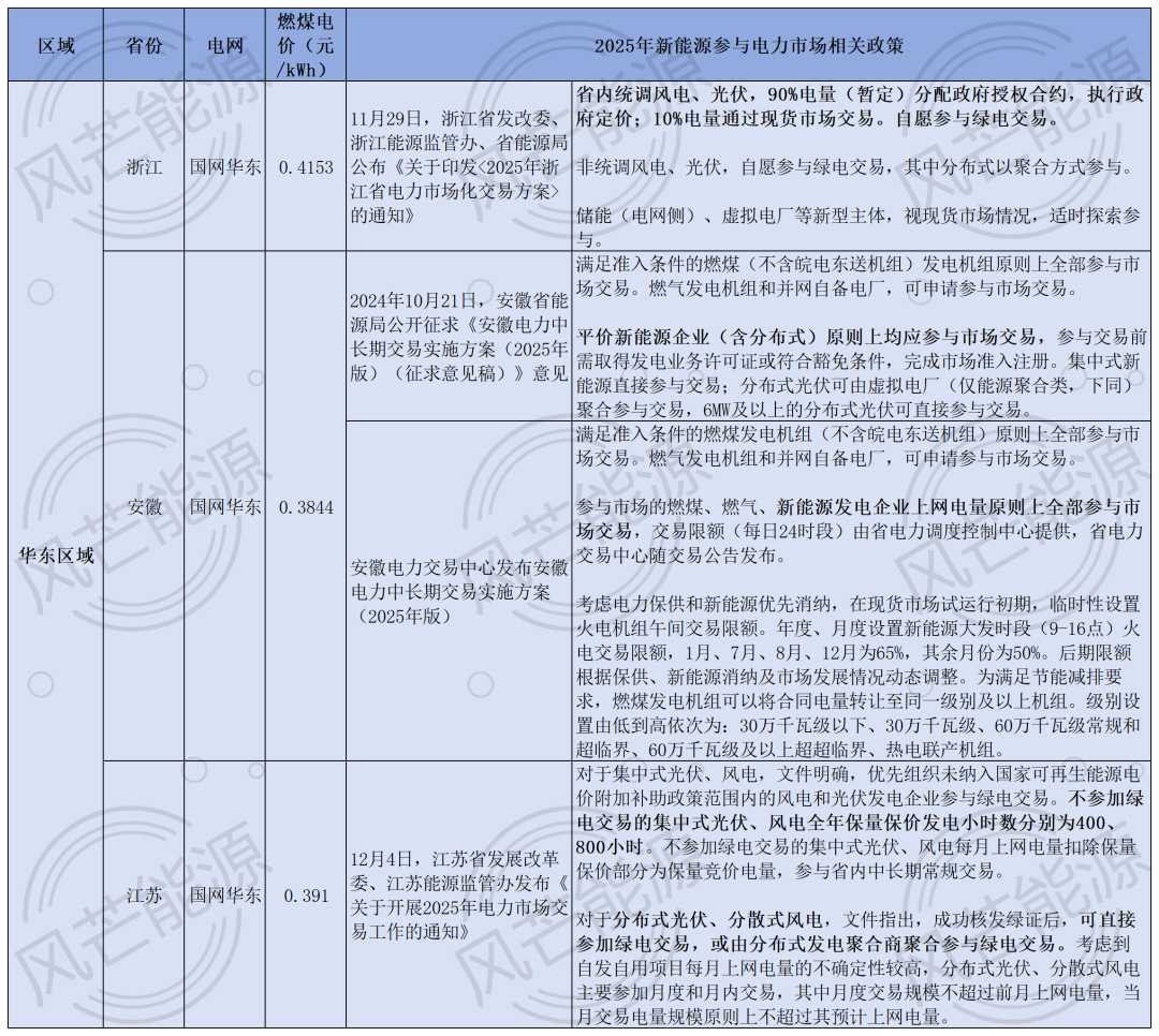 從已有政策層面來(lái)看,目前華東三省均已發(fā)布2025年電力交易方案。整體來(lái)看,除安徽外,其余省份2025年市場(chǎng)交易規(guī)模與2024年基本持平,入市主體和入市比例有所變化。
