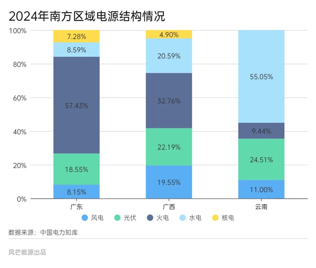 廣東省電力裝機(jī)中,火電占明顯主導(dǎo),裝機(jī)比例接近60%,而風(fēng)、光裝機(jī)規(guī)模雖突破50GW,但整體裝機(jī)比例并不算高,為26.7%;廣西電源結(jié)構(gòu)的主要特點(diǎn)在于均衡,風(fēng)、光、火、水四大電源裝機(jī)比例基本相當(dāng),火電最高,為32.76%,風(fēng)電最低,為19.55%;云南的電源結(jié)構(gòu)則以水電為主,裝機(jī)占比達(dá)55.05%,火電裝機(jī)反而最好,占比不足10%。