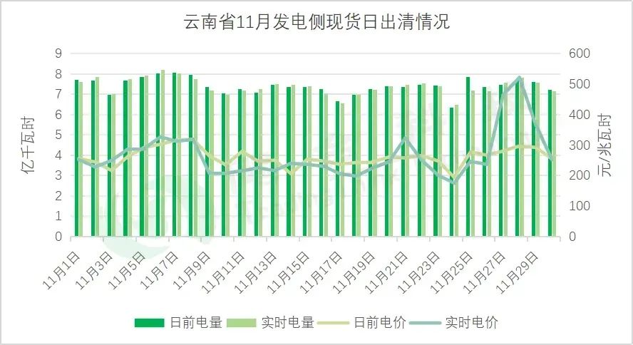 云南2024年四季度均開(kāi)展了現(xiàn)貨結(jié)算試運(yùn)行,3月28-31日現(xiàn)貨平均結(jié)算價(jià)格為301.91元/兆瓦時(shí);6月6、7日及24-30日現(xiàn)貨平均結(jié)算價(jià)格為245.59元/兆瓦時(shí);8月22-31日發(fā)電側(cè)日前平均電價(jià)為224.87元/兆瓦時(shí),實(shí)時(shí)平均電價(jià)為284.84元/兆瓦時(shí);11月整月發(fā)電側(cè)日前平均電價(jià)為261.75元/兆瓦時(shí),實(shí)時(shí)平均電價(jià)為267.62元/兆瓦時(shí)。