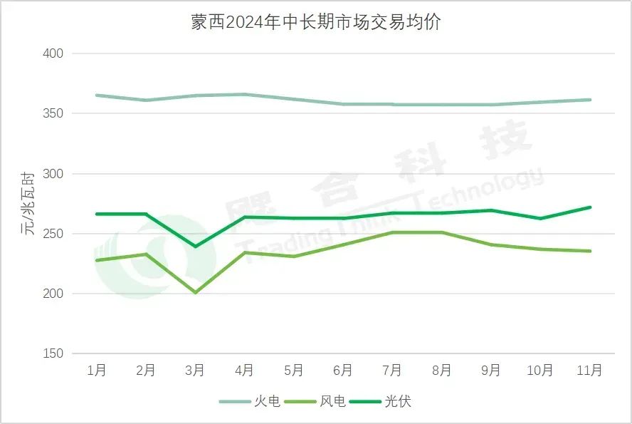 從電力交易情況來(lái)看,蒙西2024年電力多邊交易區(qū)內(nèi)交易電量2665.27億千瓦時(shí),平均成交價(jià)格291.18元/兆瓦時(shí),新能源合約電量906.98億千瓦時(shí),平均交易價(jià)格221.26元/兆瓦時(shí)。其中風(fēng)電合約電量651.38億千瓦時(shí),平均交易價(jià)格213元/兆瓦時(shí);光伏合約電量220.25億千瓦時(shí),平均交易價(jià)格240.67元/兆瓦時(shí)。并將新能源交易品種全部視為綠電交易,設(shè)置環(huán)境價(jià)格,其中環(huán)境價(jià)值為30.8元/兆瓦時(shí)。