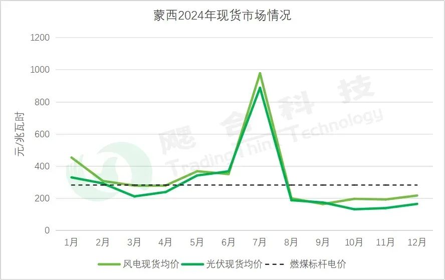同時(shí),飔合科技分析指出,蒙西光伏裝機(jī)占比較高,受供需條件影響,午間時(shí)段光伏集中出力下極易出現(xiàn)現(xiàn)貨價(jià)格為0元/兆瓦時(shí)的極端情況;而其余非午間時(shí)段現(xiàn)貨價(jià)格受市場(chǎng)壟斷因素顯著影響,在蒙西火電機(jī)組“抱團(tuán)策略”下呈現(xiàn)出明顯的高峰時(shí)段。2024年市場(chǎng)實(shí)時(shí)現(xiàn)貨均價(jià)484.67元/兆瓦時(shí),其中風(fēng)電現(xiàn)貨均價(jià)332.72元/兆瓦時(shí),光伏現(xiàn)貨均價(jià)289.52元/兆瓦時(shí)。