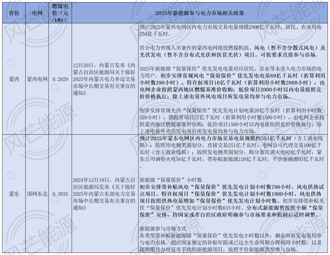 從已有政策層面來(lái)看,蒙東、蒙西均已發(fā)布2025年電力交易方案。蒙東2025年放開(kāi)用戶(hù)側(cè)打捆購(gòu)電比例限制,增加新能源年度交易不得低于60%,按照補(bǔ)貼新能源、火電、平價(jià)新能源開(kāi)展交易;蒙西進(jìn)一步放開(kāi)市場(chǎng)限制取消日清分節(jié)點(diǎn)電價(jià)下限約束。