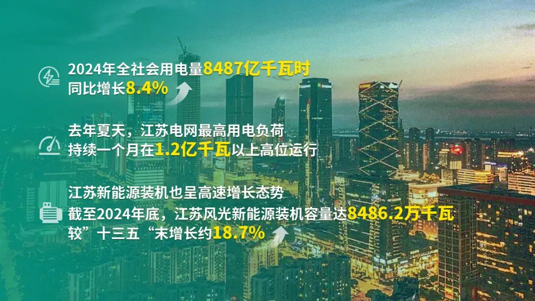 江蘇是我國經(jīng)濟(jì)最發(fā)達(dá)的省份之一,2024年全社會用電量達(dá)8487億千瓦時,同比增長8.4%。去年夏天,江蘇電網(wǎng)最高用電負(fù)荷持續(xù)一個月在1.2億千瓦以上高位運行。