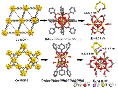 圖3 Ce-MOF-1和Ce-MOF-2的結(jié)構(gòu)、金屬節(jié)點和Li2S6吸附位點[18]