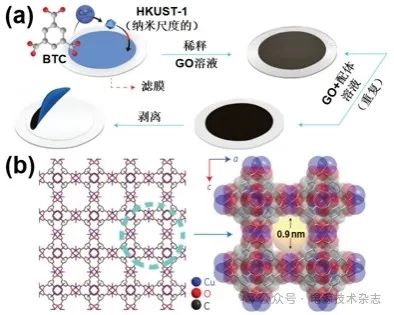(a)MOF@GO隔膜的制備工藝示意圖 (b)HKUST-1微孔晶體結(jié)構(gòu)示意圖[23]