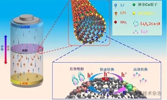 極性金屬化合物對LiPSs表現(xiàn)出優(yōu)異的電催化性能和較強的化學(xué)吸附能力。Xie等[19]采用化學(xué)氣相沉積法合成鈷基MOF復(fù)合氮摻雜碳納米管CNT/N-Co三維納米復(fù)合材料后,在表面負(fù)載TiO2納米顆粒以制備CNT/N-Co@TiO2復(fù)合隔膜(圖5)。極性組分TiO2對LiPSs的吸附、催化作用能有效抑制穿梭效應(yīng),防止因LiPSs在正極側(cè)的堆積,影響Li+傳輸。盡管金屬化合物有較強的LiPSs吸附力,但離子電導(dǎo)率、催化效果、孔隙率和比表面積不及MOFs衍生的金屬化合物。