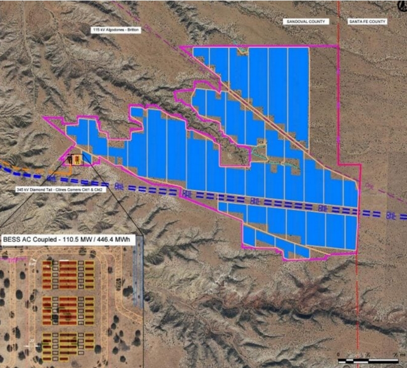 根據(jù)PCR Energy US公司提交給桑多瓦爾縣委員會的文件,Diamond Tail太陽能+儲能項目其中包括一座220MW太陽能發(fā)電場以及配套部署的一個110MW/440MWh電池儲能系統(tǒng),該發(fā)電場位于新墨西哥州桑多瓦爾和圣達(dá)菲縣邊界的El Llanito社區(qū)以東約15英里處。