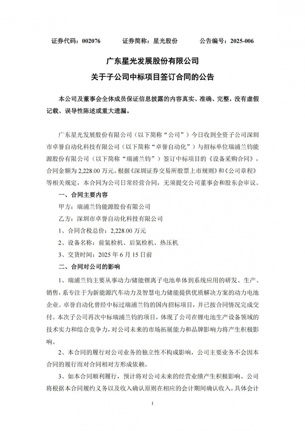 中國儲能網(wǎng)訊:近日,星光股份發(fā)布公告稱,公司全資子公司深圳市卓譽自動化科技有限公司與招標單位瑞浦蘭鈞能源股份有限公司簽訂中標項目的《設備采購合同》,合同金額為2228萬元。設備名稱為前氦檢機、后氦檢機、熱壓機,交貨時間2025年6月15日前。