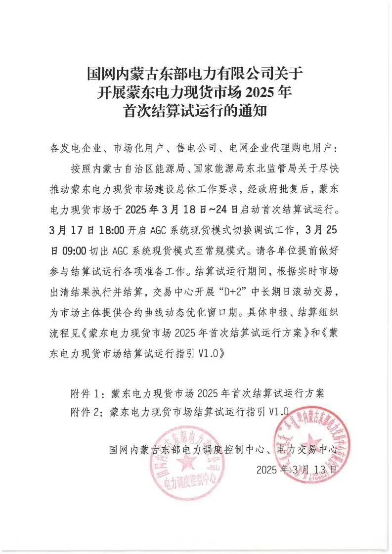 中國儲能網(wǎng)訊:近日,國網(wǎng)內(nèi)蒙古東部電力有限公司發(fā)布《蒙東電力現(xiàn)貨市場2025年首次結(jié)算試運行工作方案》《蒙東電力現(xiàn)貨市場結(jié)算試運行指引V1.0》。