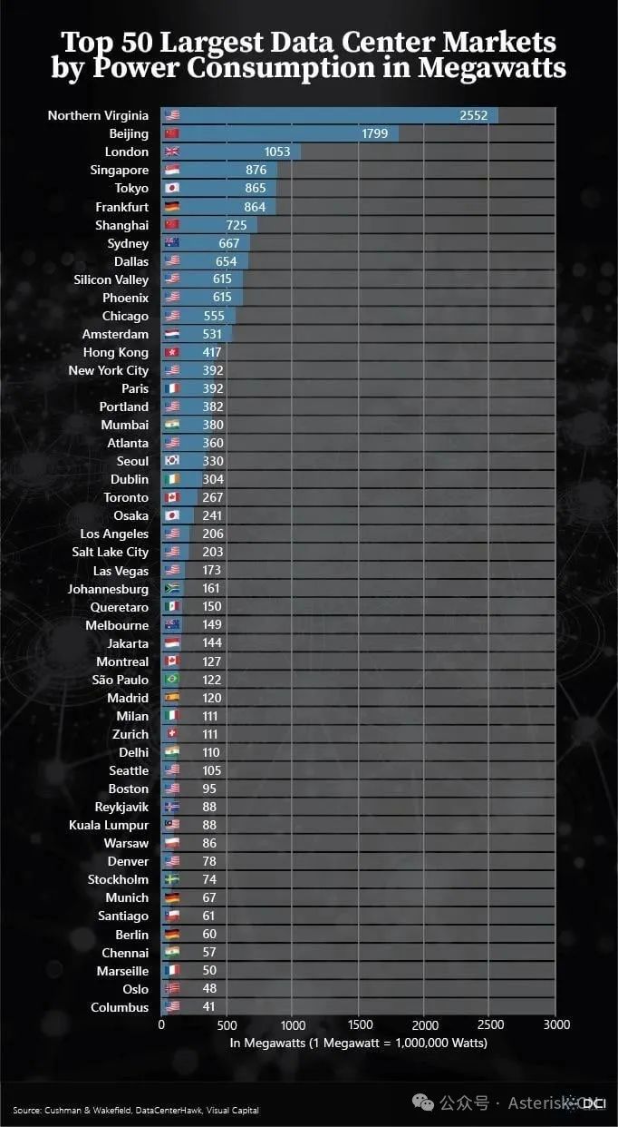 按照電力消耗計算的全球最大數(shù)據(jù)中心,50個。