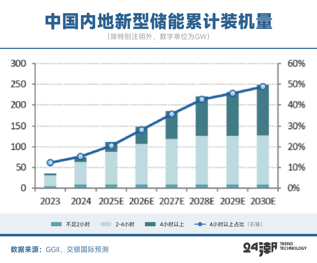 根據(jù)交銀國際分析,預計2025年起國內(nèi)長時儲能市場將快速增長,到2025/2030年,4小時以上儲能占比分別提升至21%/50%,2025-2030年4小時以上儲能新增裝機規(guī)模合計超100GW。