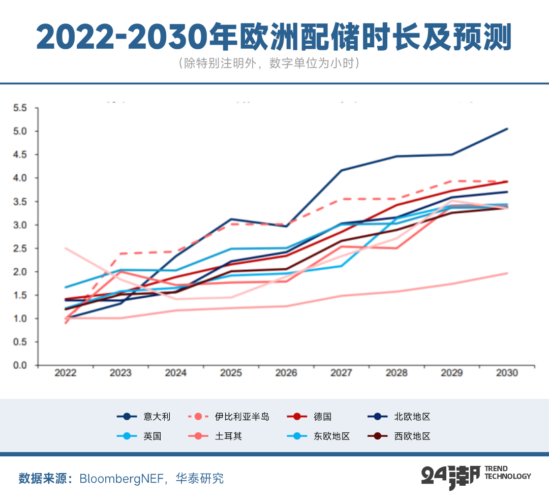 實際上,隨著歐洲新能源并網(wǎng)比例的增加,電力系統(tǒng)對靈活調(diào)節(jié)能力的需求不斷上升,凸顯長時儲能需求,歐洲大儲項目的配儲時長自2022年以來逐步延長。根據(jù)BloombergNEF預測,到2030年,意大利的配儲時長將達約5.1小時,相比2024年的2.3小時增長一倍以上。較長的配儲時長使儲能系統(tǒng)能夠更有效地應(yīng)對電力需求高峰和低谷,提升系統(tǒng)的盈利潛力。