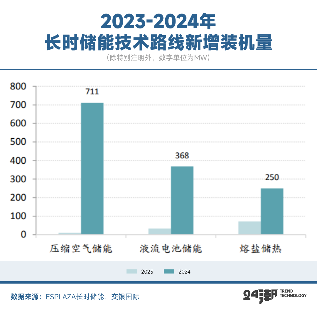事實也確實如此。根據(jù)ESPLAZA長時儲能數(shù)據(jù)庫統(tǒng)計,截至2024年底,內(nèi)地新型長時儲能累計裝機達2.3GW ,2024年實現(xiàn)新增新型長時儲能并網(wǎng)/投運裝機規(guī)模約1.3GW/8.1GWh。其中,壓縮氣體儲能新增裝機規(guī)模同比增長超70倍至711MW,容量占比約53%;液流電池增長超10倍至368MW,容量占比約28%;熔鹽儲能增長250%至250MW,容量占比約19%。