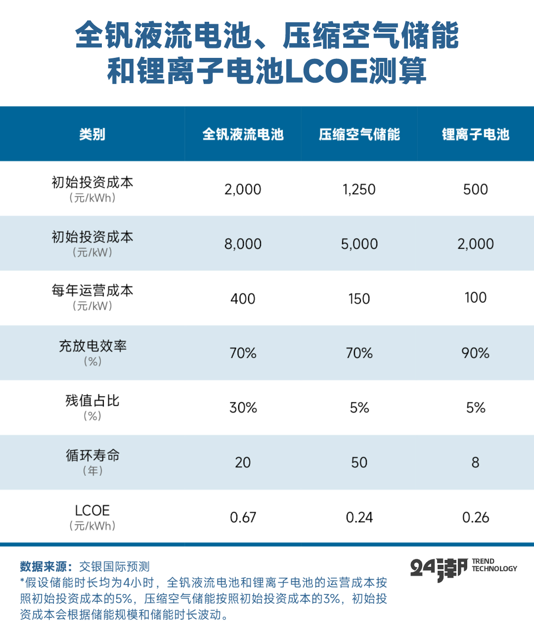 所以,交銀證券判斷 “在中短期內(nèi),鋰離子電池、壓縮空氣、液流電池三者將直接參與長時儲能的競爭?!?/span>