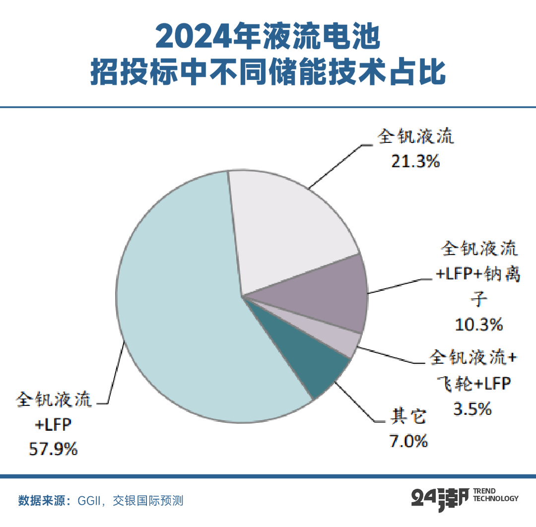 根據(jù)GGII數(shù)據(jù),2024年液流電池招投標超3GW,其中混合儲能占比超過71.8%。全釩液流電池+磷酸鐵鋰電池(LFP)混合儲能項目占比近六成,兩者結(jié)合后,既發(fā)揮液流電池長時儲能和高功率的特性,又借助磷酸鐵鋰電池提升整體能量密度,彌補了單一儲能技術(shù)在不同應(yīng)用場景下的缺陷。