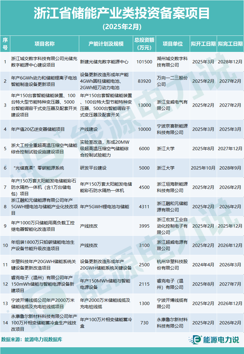 2月浙江省完成備案產(chǎn)業(yè)類儲能項目14個,總投資24.20億元,
