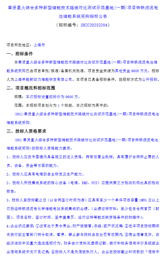 中國儲能網(wǎng)訊:3月19日,申能集團旗下上海申能新動力儲能研發(fā)有限公司發(fā)布奉賢星火綜合多種新型儲能技術(shù)路線對比測試示范基地(一期)項目鋅鐵液流電池儲能系統(tǒng)采購招標公告。