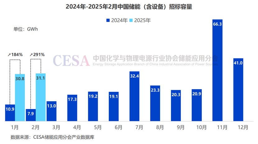 盡管通常一季度為淡季,但2025年以來國內(nèi)儲能招投標(biāo)市場依舊相當(dāng)火爆。據(jù)CESA儲能應(yīng)用分會產(chǎn)業(yè)數(shù)據(jù)庫不完全統(tǒng)計(jì),2025年1月、2月國內(nèi)儲能(含直流側(cè)設(shè)備)招標(biāo)規(guī)模分別為8.98GW/30.8GWh、7.99GW/31.08GWh,容量規(guī)模同比增長184%、291%,其中包括多個儲能電芯/系統(tǒng)集采招標(biāo)項(xiàng)目。