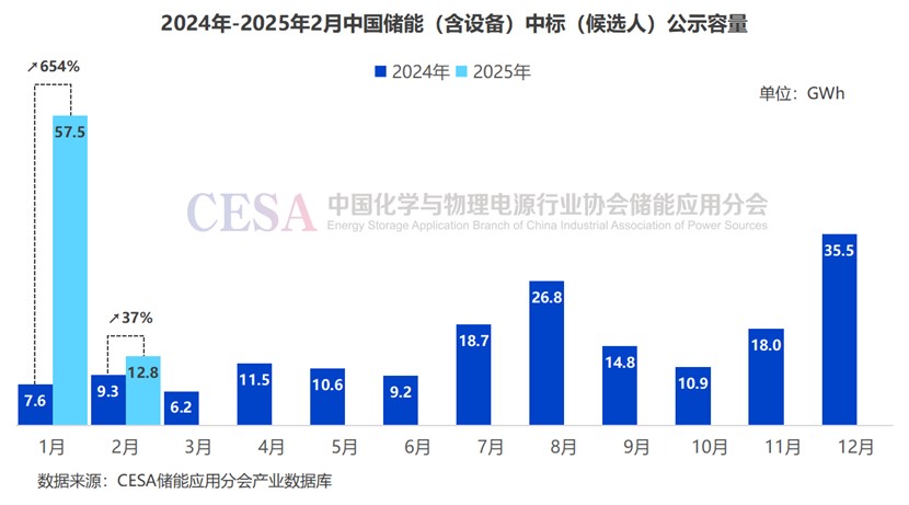 2025年1月、2月國內(nèi)儲能(含直流側(cè)設(shè)備)采招落地規(guī)模為6.7GW/57.51GWh、3.68GW/12.77GWh,容量規(guī)模同比增長654%、37%。