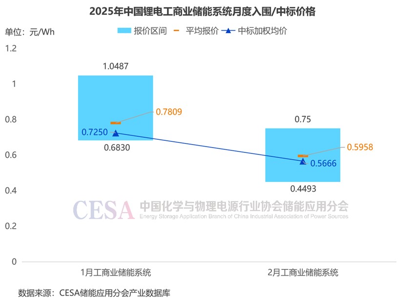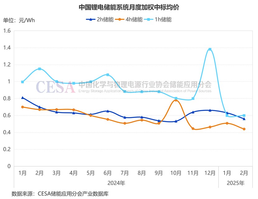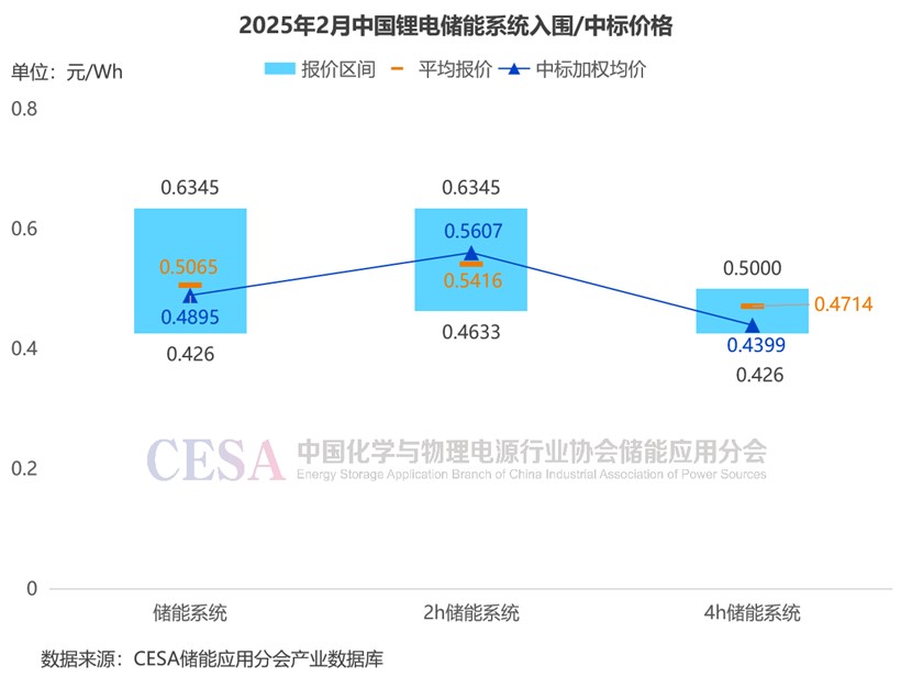 2025年2月鋰電儲能系統(tǒng)入圍投標(biāo)報價范圍為0.426-0.6345元/Wh,平均報價0.5065元/Wh,中標(biāo)加權(quán)均價0.4895元/Wh,環(huán)比-2.07%。