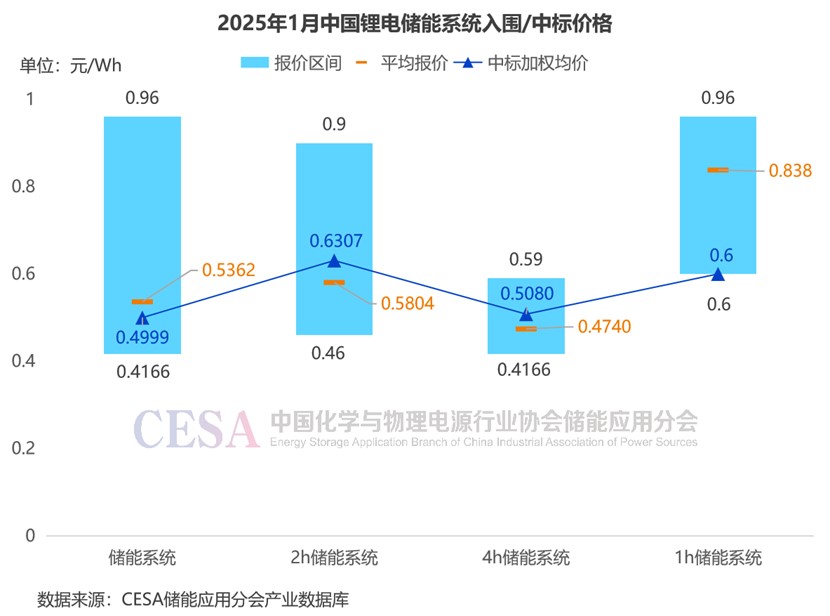 2025年1月鋰電儲能系統(tǒng)入圍投標(biāo)報價主要集中在0.4166-0.96元/Wh,平均報價0.5362元/Wh,中標(biāo)加權(quán)均價0.4999元/Wh,環(huán)比-8.63%。